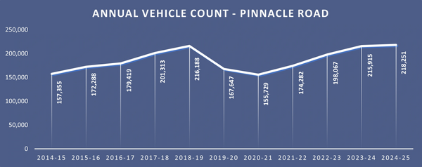 The Trust uses the ATLYST platform to assess traffic counter data that has been collected by the City of Hobart since May 2014. The traffic counter records vehicle counts, speed, direction and vehicle class. In 2025, annual data was updated to reflect financial year totals instead of calendar years. The busiest day on Pinnacle Rd on record was 26 Sept 2021, when 1,871 vehicle entered Wellington Park following heavy snowfall. The busiest day in 24-25 was 18 January 2025, when 1,368 vehicles entered the Park for no discernible reason other than it being a warm and perfectly clear Saturday!